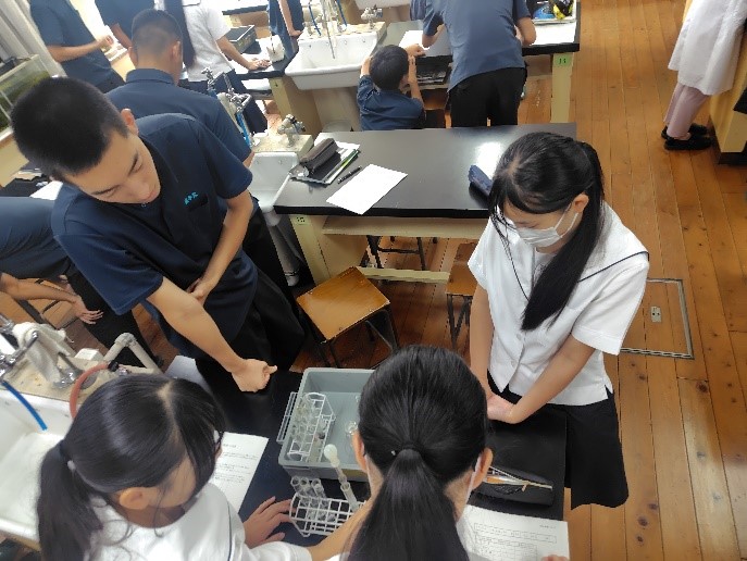 4人一組のグループで協力して実験を進めていましたが、発生した気体の特徴が分かる結果が出たときは、生徒たちが喜んでいる姿を見ることができました。