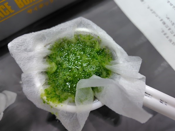 冷凍されたブロッコリーを材料にして、抽出液から不純物をろ過し、粗DNA溶液を作成しました。担当の先生から、DNAの性質や使用する試薬などの説明の後、冷エタノール溶液をゆっくりと入れることでDNAが析出していました。
