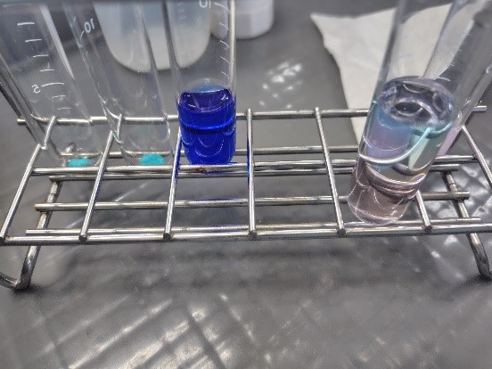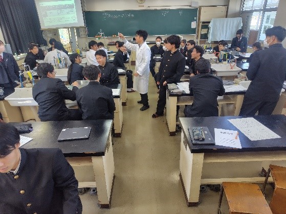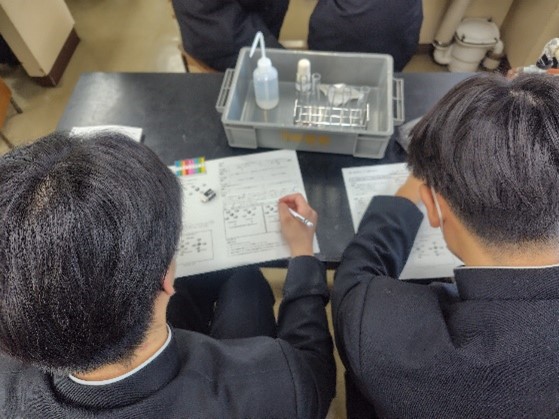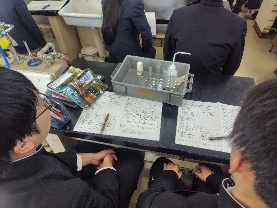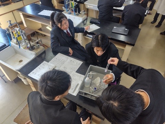 鮮やかな青色の溶液や2層に分かれて色が変化する様子などを確認していました。生徒たちは実験プリントに記入しながら予想の結果を確認していました。