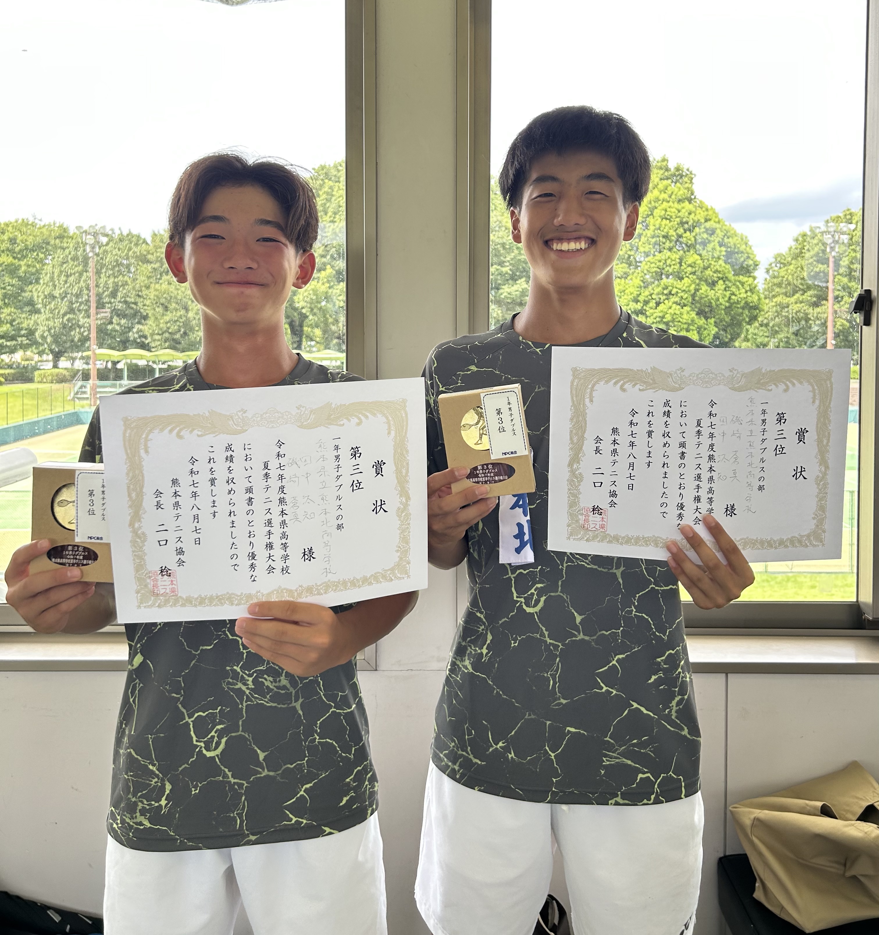 令和7年8月7日(木)・8日(金)に県民総合運動公園にて、熊本県高等学校夏季テニス選手権大会ダブルスの部が行われました。結果は1年男子ダブルスの部で磯﨑蒼真さん・田中汰知さんが第3位となり、素晴らしい成績を収めました。