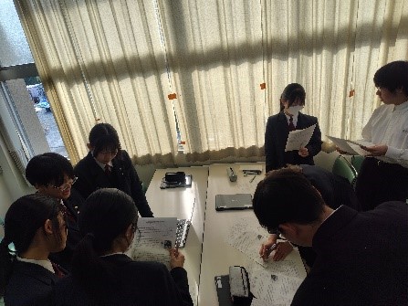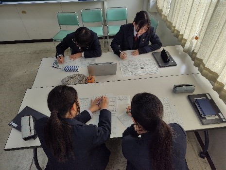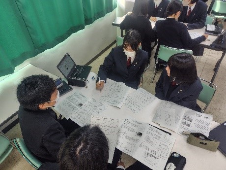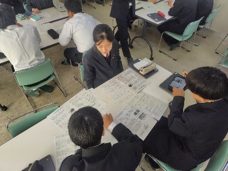 英語科と理数科の生徒がグループを作り、ALTのアリソン先生の説明の後、英語の論文(バナナ論文)を読み解いていきます。まずは、バナナ論文を読みワークシートに記入したり、重要語句に線を引いていきます。専門用語などは意味を調べながら、またお互いに聞きながら進めていました。その後、別の班と調べた内容の共有を行っていました。