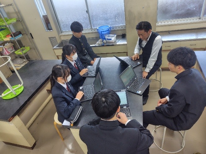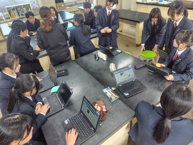 また、1年ARⅠ(理数科)の代表班は生物教室に集まり、モニターを使って発表練習に取り組んでいました。時折、担当の先生からのアドバイスを受けて改善を進めているようでした。