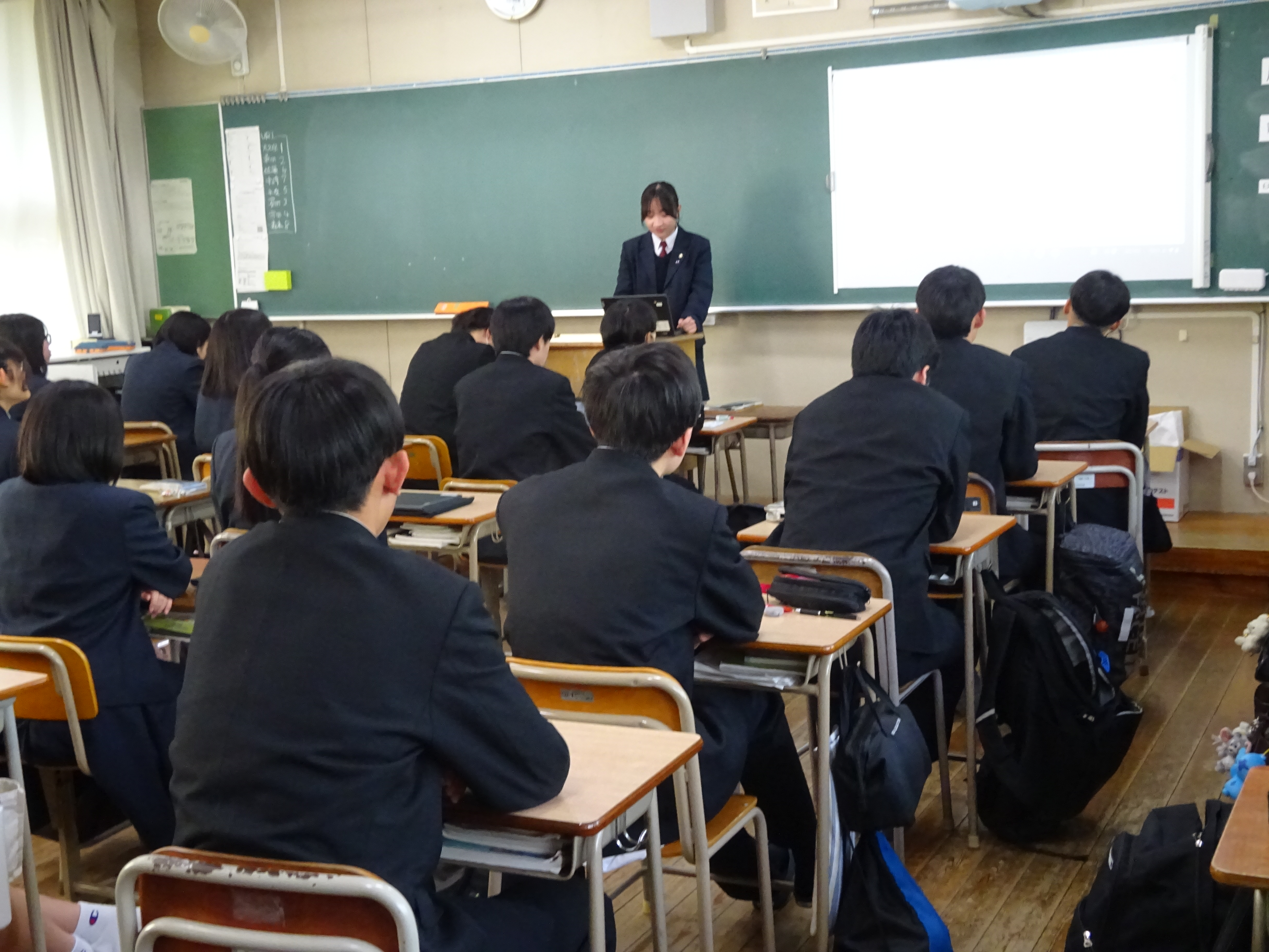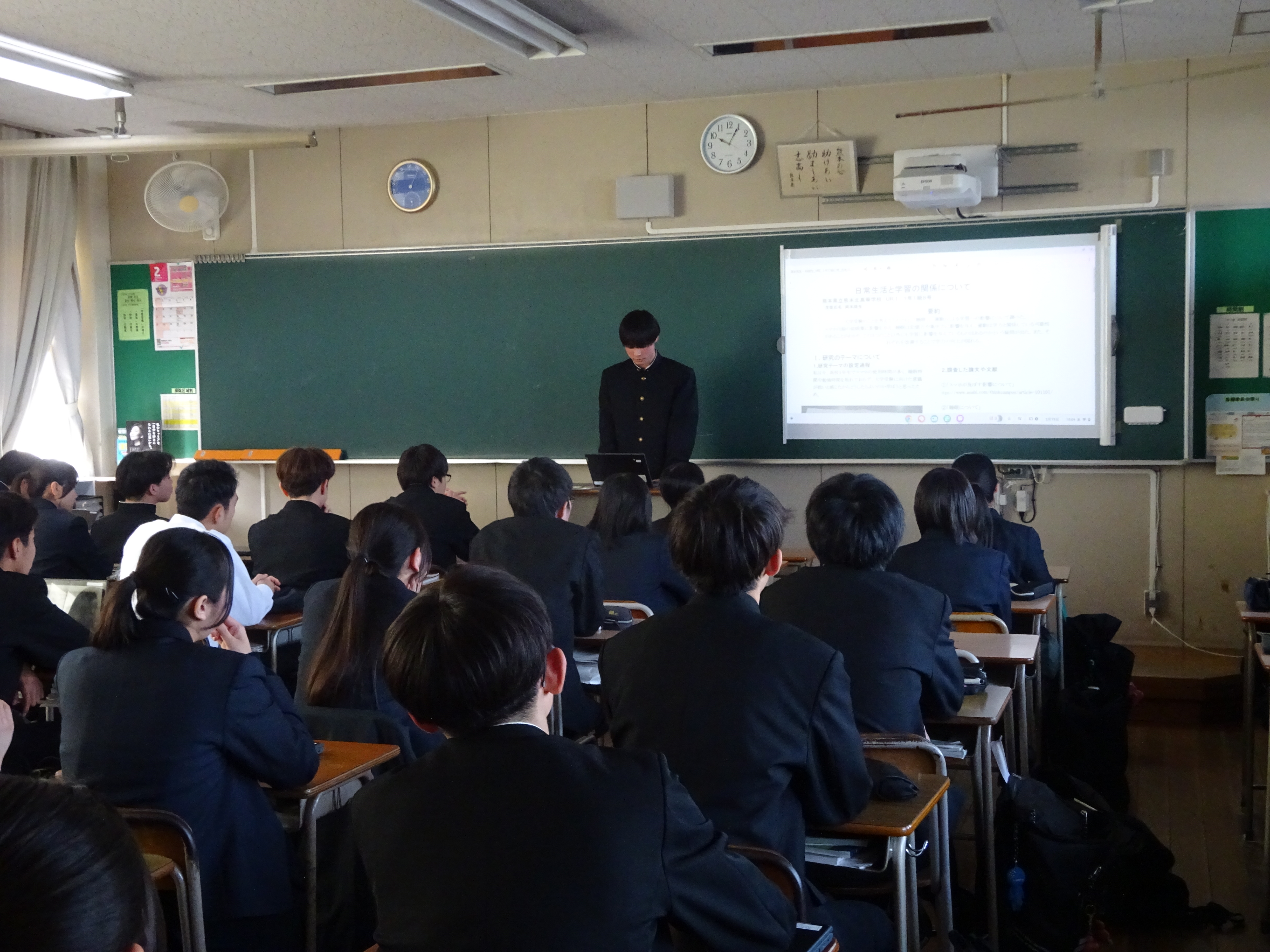 2月19日(木)に1年生の各教室でURⅠ(課題研究)の成果発表会を行いました。1年生は、1年間の前半で「アントレプレナーシップ教育」(社会貢献を目的としたグループでの商品開発)に取り組み、後半で「プレ課題研究」(一人一人の興味・関心に沿った個人研究)に取り組みました。今回の発表会は、後半の個人研究の成果を、クラスのみんなに報告するものでした。物理・化学などの本格的な研究から生活や社会課題などの身近な内容まで、興味深いテーマが多く、各発表の後にはクラスのみんなから、温かい拍手が送られていました。1年間の成果を、ぜひ2年生につなぎ、さらに充実した研究を進めてほしいと思います。
