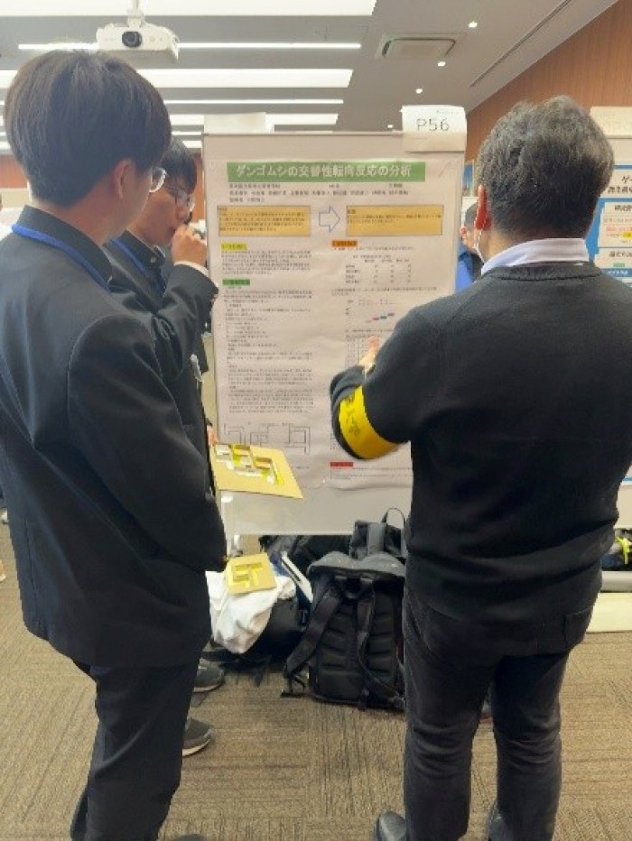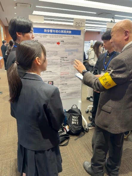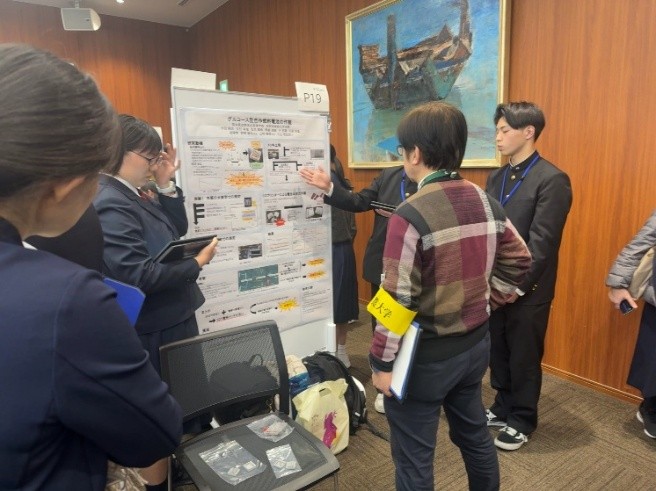 ポスターセッションの中で、大学の先生方や他校の先生方から質問やアドバイス等をもらい、自分たちの研究を改めて評価し直す良い機会となりました。最初は緊張している様子でしたが、回数を重ねるごとに交流を楽しみながら発表をすることができました。