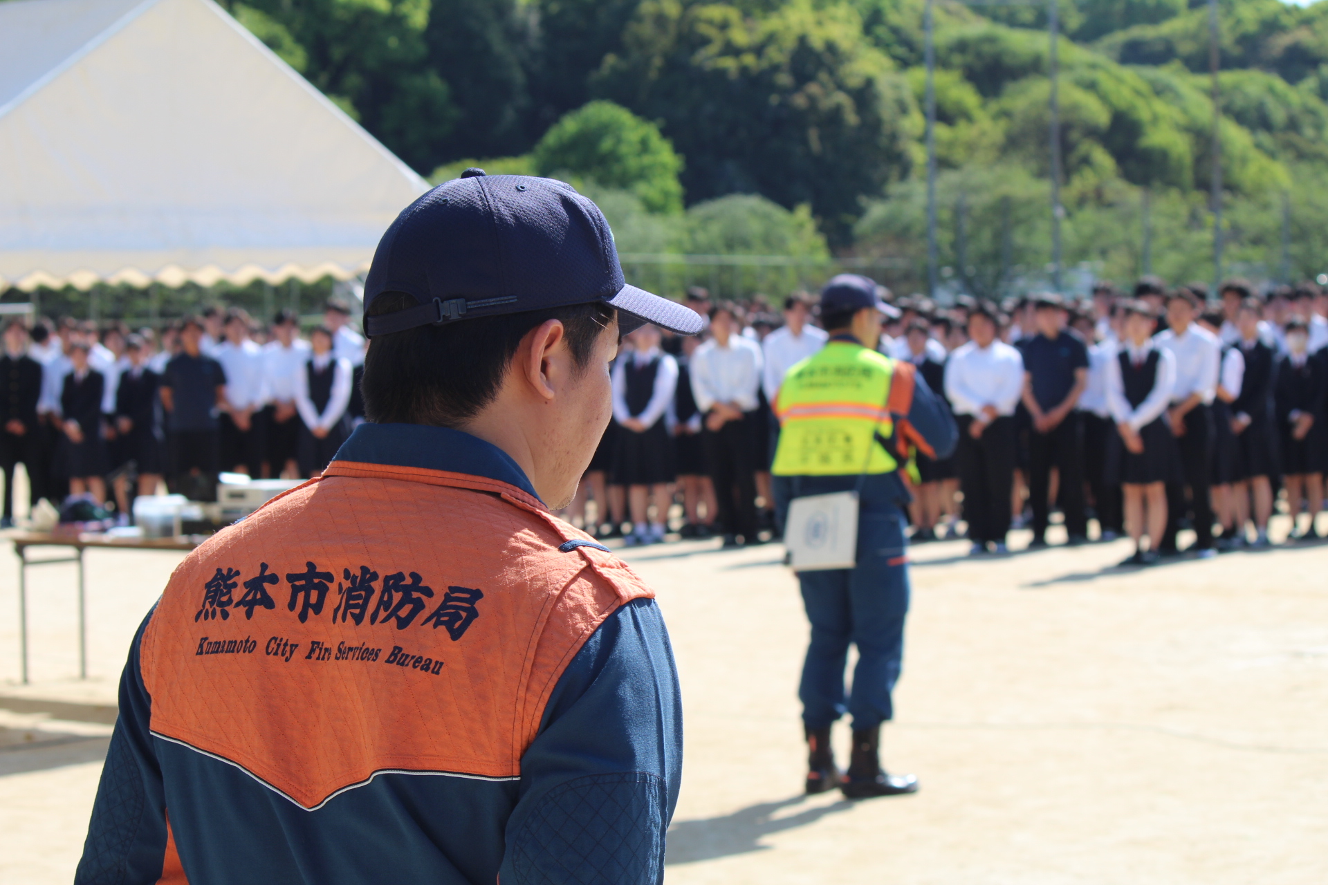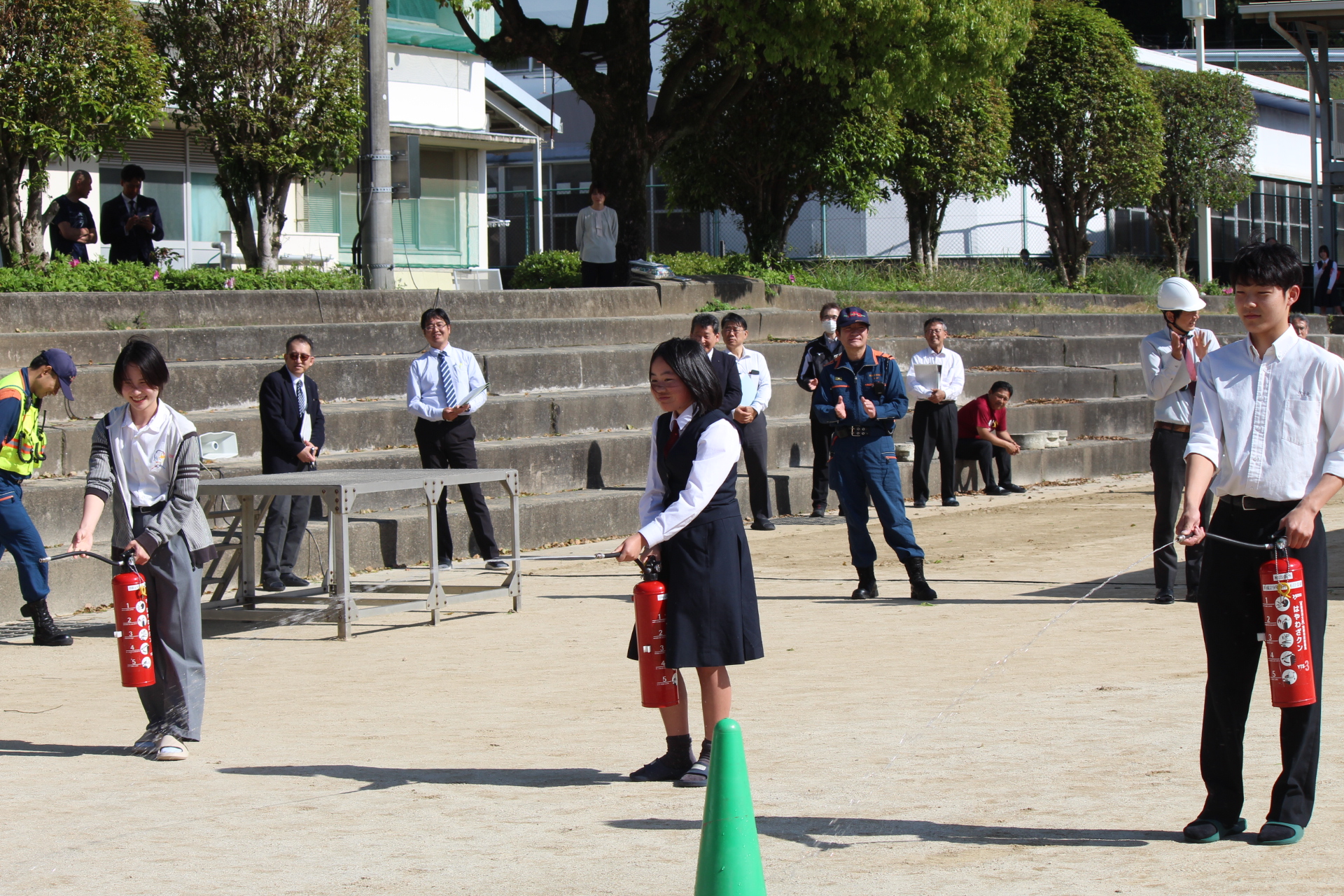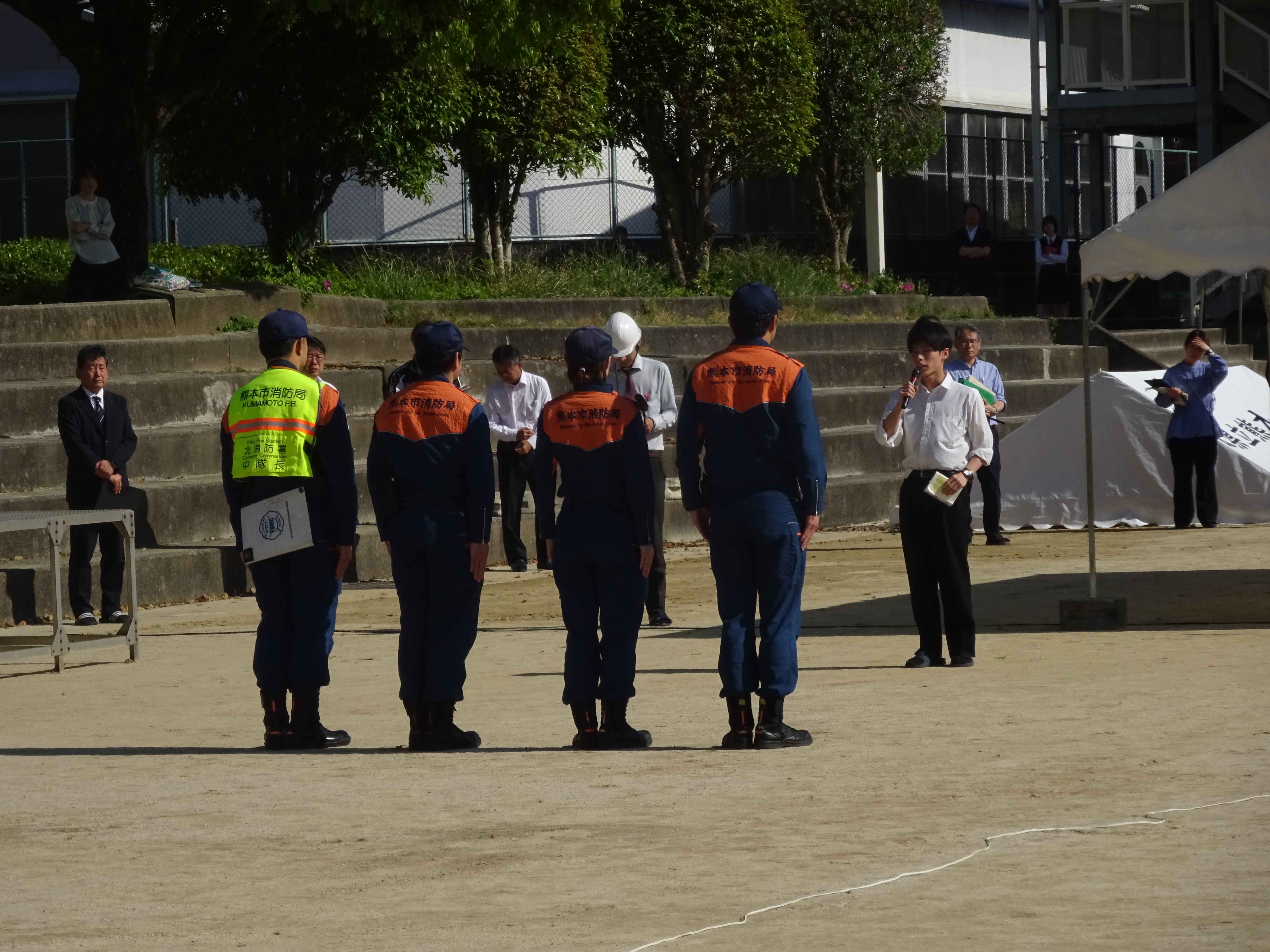 熊本地震本震発生から10年目の4月16日(木)に地震・火災避難訓練を実施しました。地震対応訓練、情報収集訓練、通報訓練、初期消火訓練、避難訓練のあと、グラウンドで本校の卒業生である熊本市消防局北消防署楠出張所の有村中隊長の講評、署員による消火器操作の説明と代表生徒・職員による消火器操作、校長総評、生徒代表謝辞という内容でした。