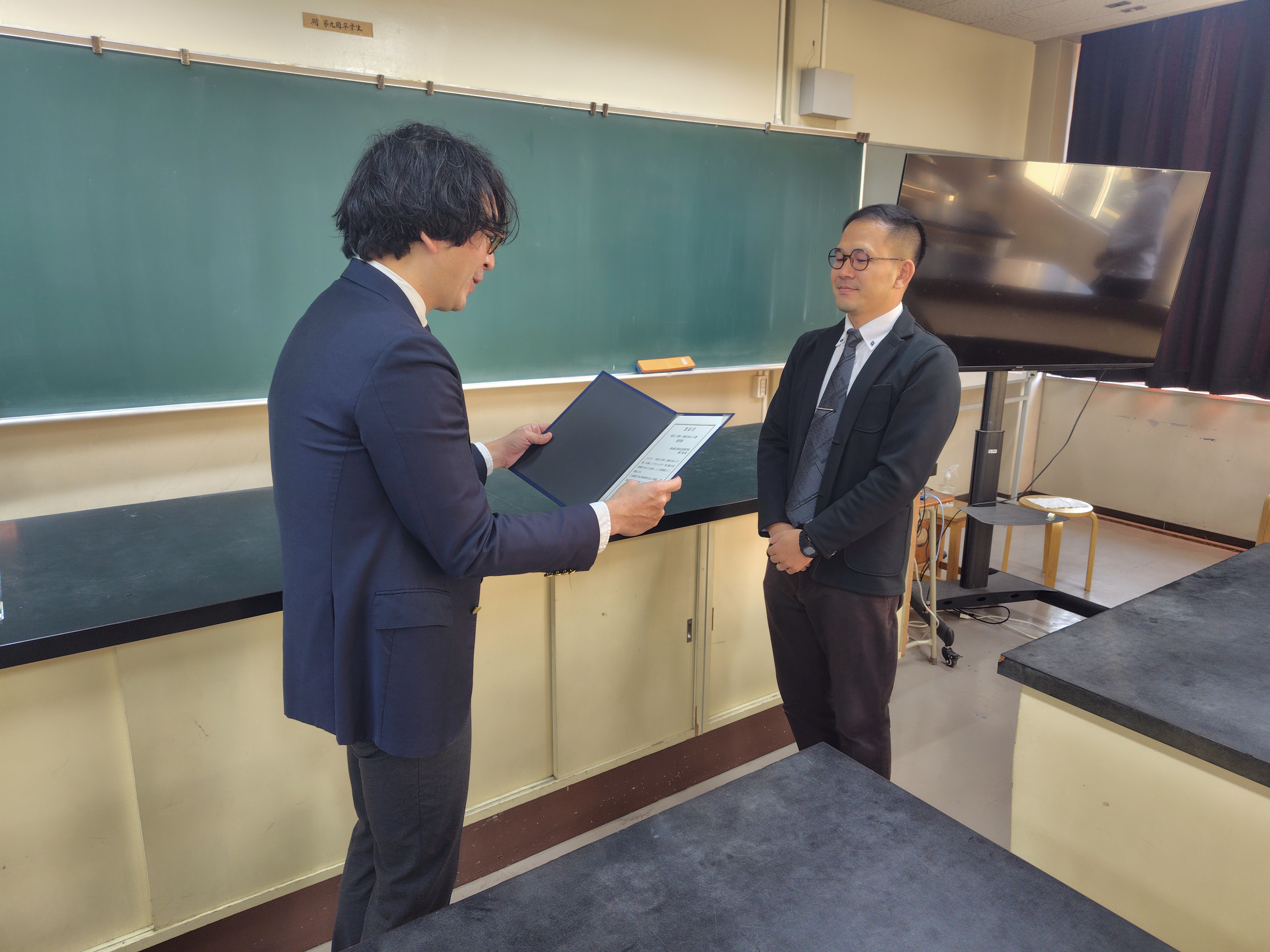 12月6日に東京理科大から渡辺教授が来校されて、橋口教諭に表彰状を手渡されました。