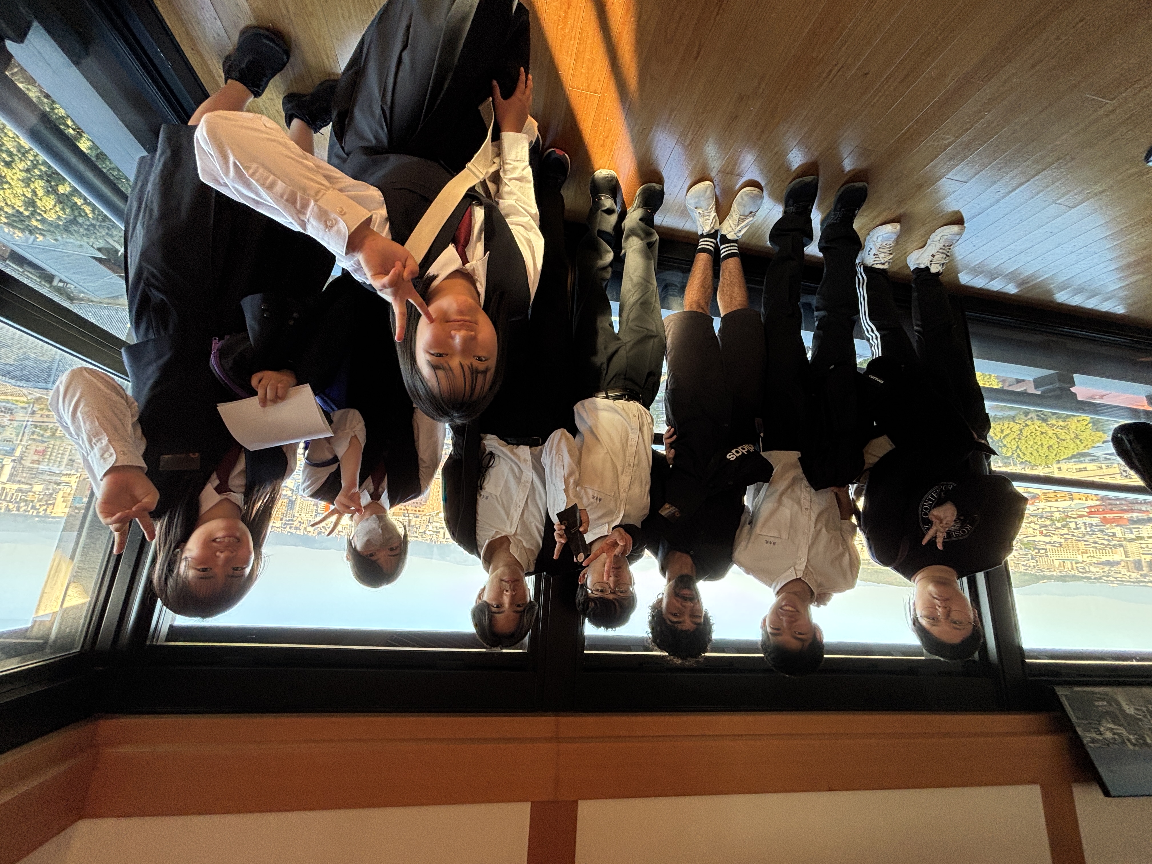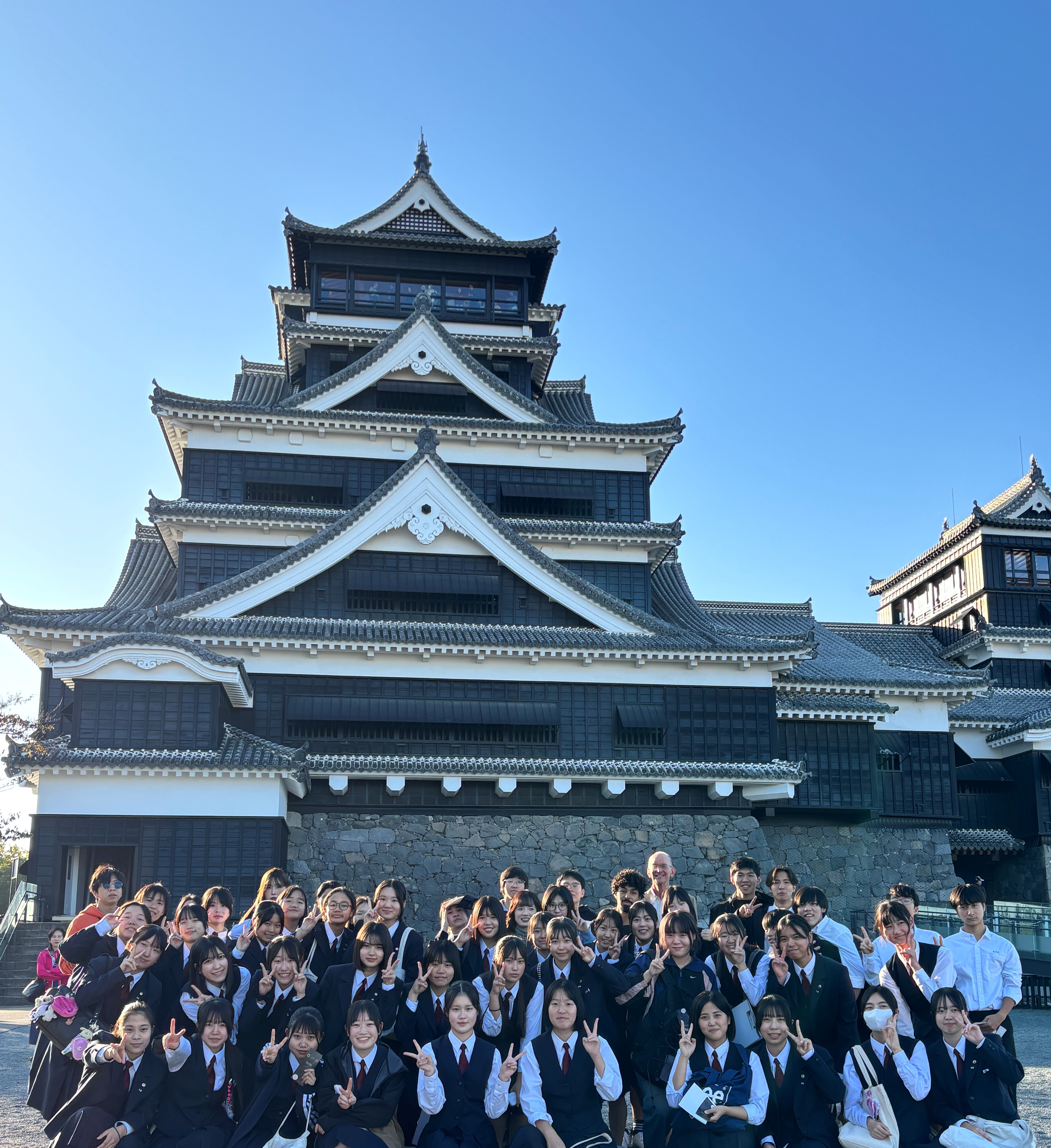本事業は2022年から異文化交流や語学力を含むコミュニケーション能力向上等を目的に行っています。今年度第3回となる今回は、1年生英語科38名が留学生12名と交流をしました。今回は6グループに分かれて熊本城でフィールドワークを行いました。マスデン先生の宇土櫓に関する説明を全体で聞き、その後グループに分かれてそれぞれ自由に散策しました。北高生はグループのメンバーがはぐれないように声をかけたり、英語等で積極的にコミュニケーションを取りながら活動していました。今後は12月の熊本学園大学での最後のプレゼンテーションに向けて準備に励みます!