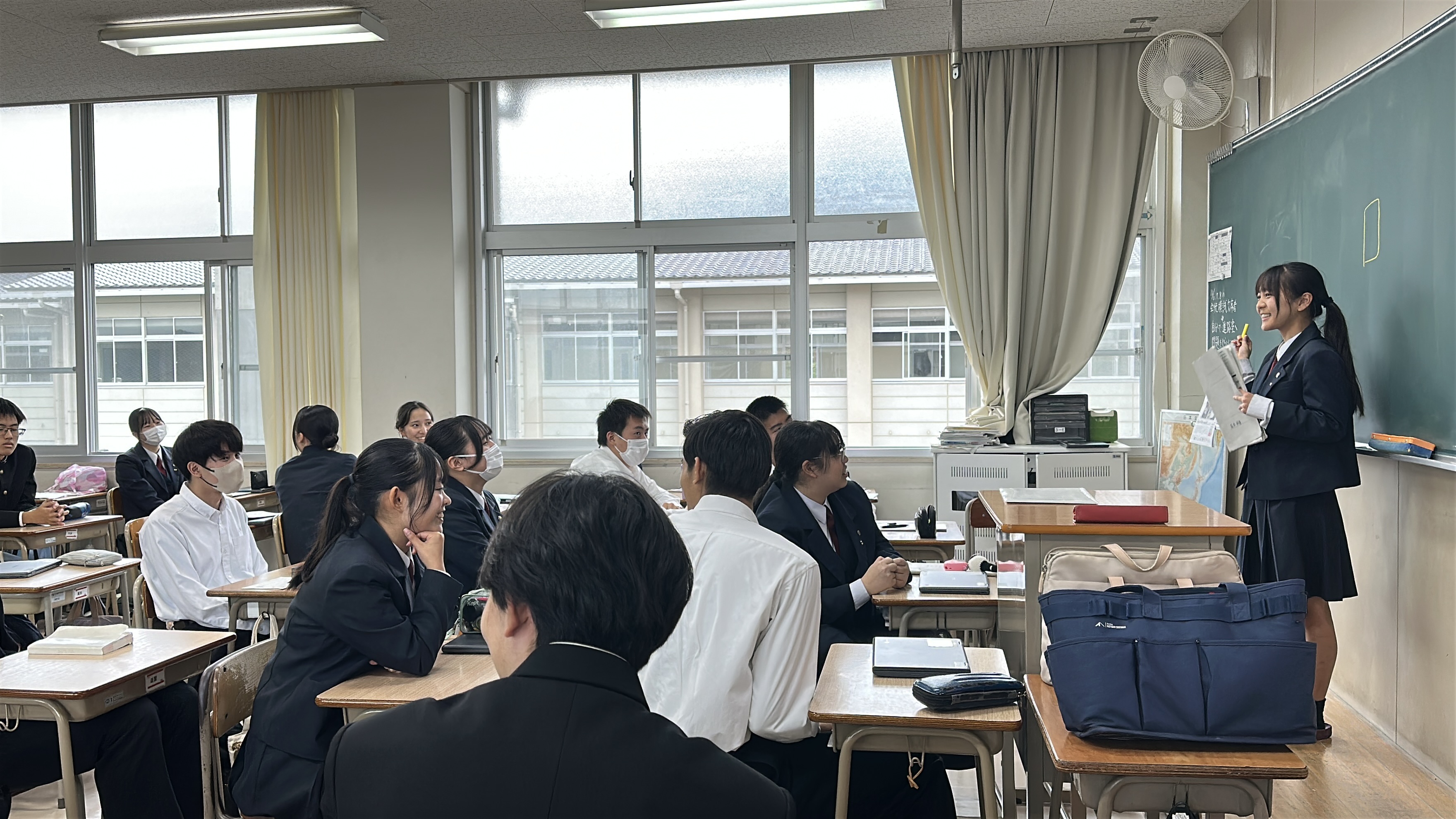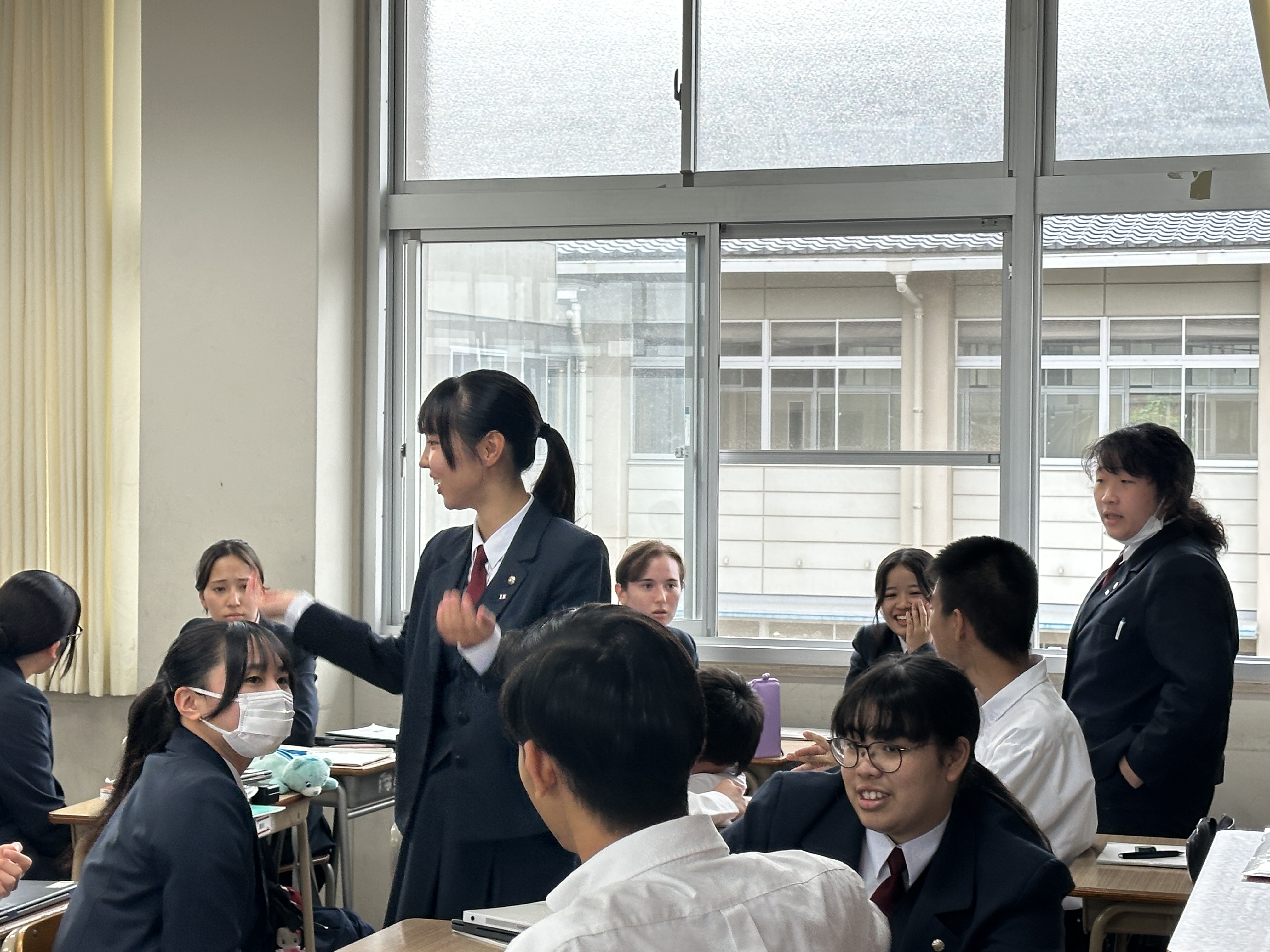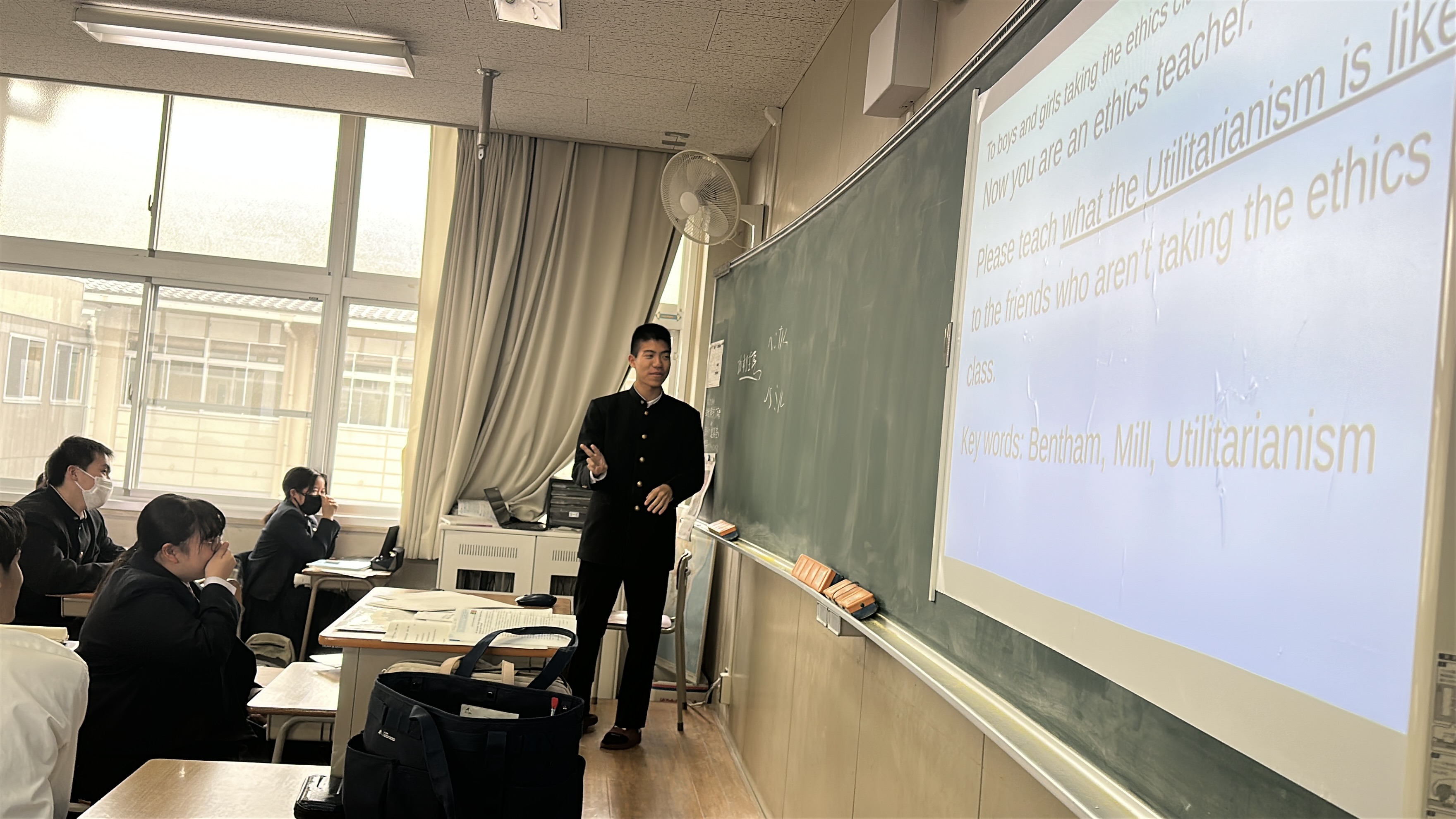 英語科は倫理選択者と政経選択者がおよそ半々であり、倫理選択者が政経選択者へ、政経選択者が倫理選択者へ、生徒が「先生」となってそれらの概念を説明しました。