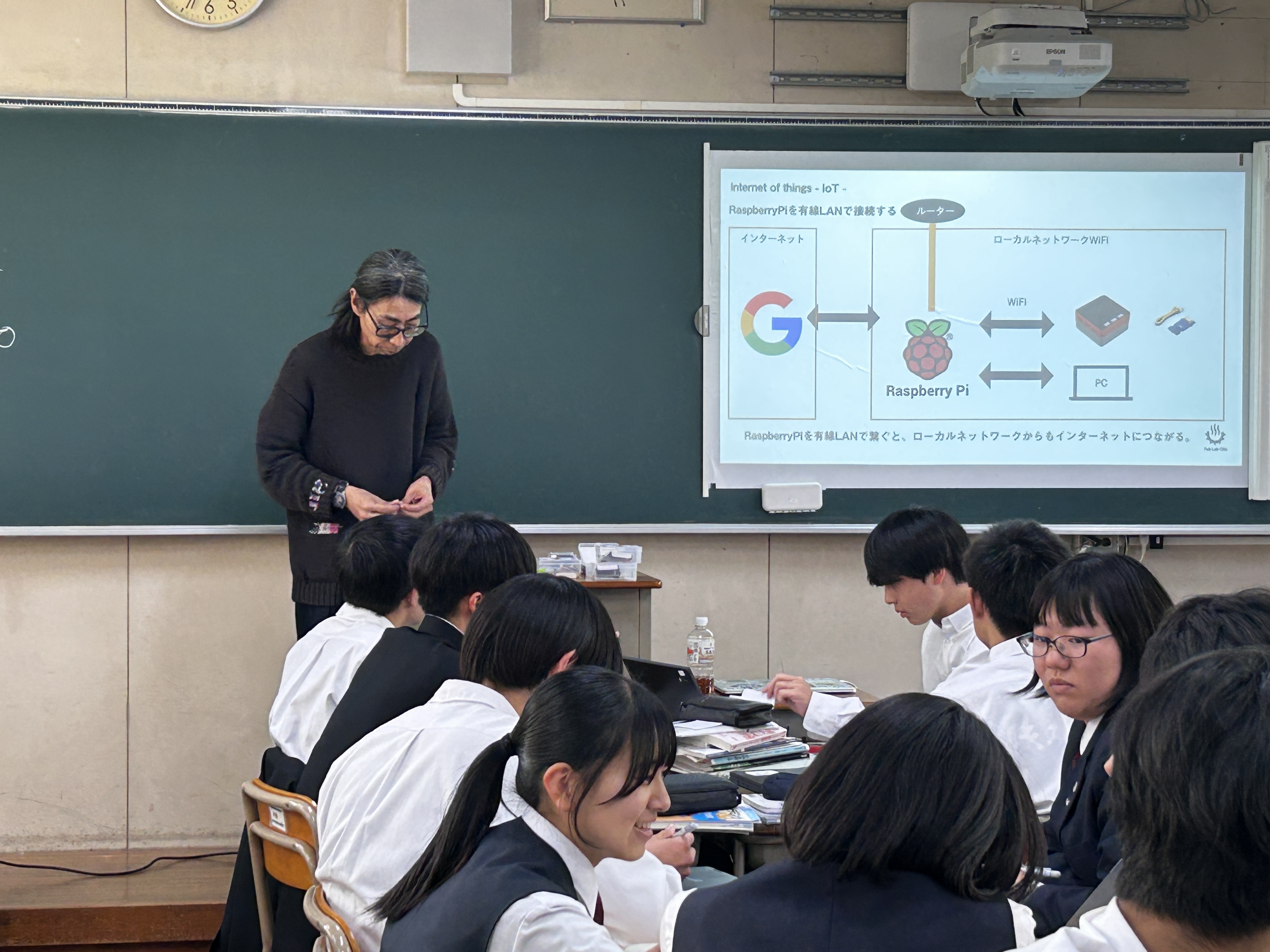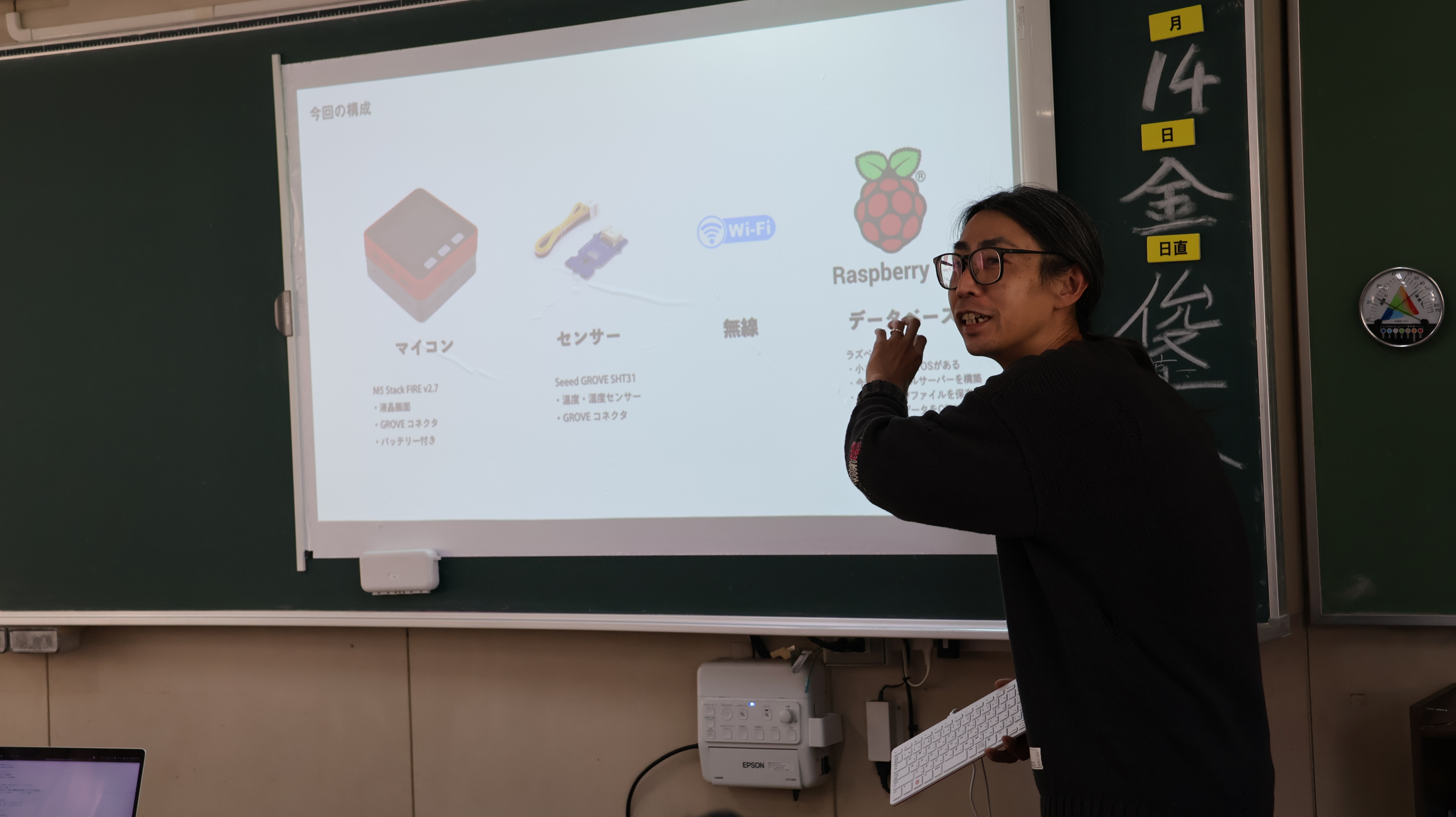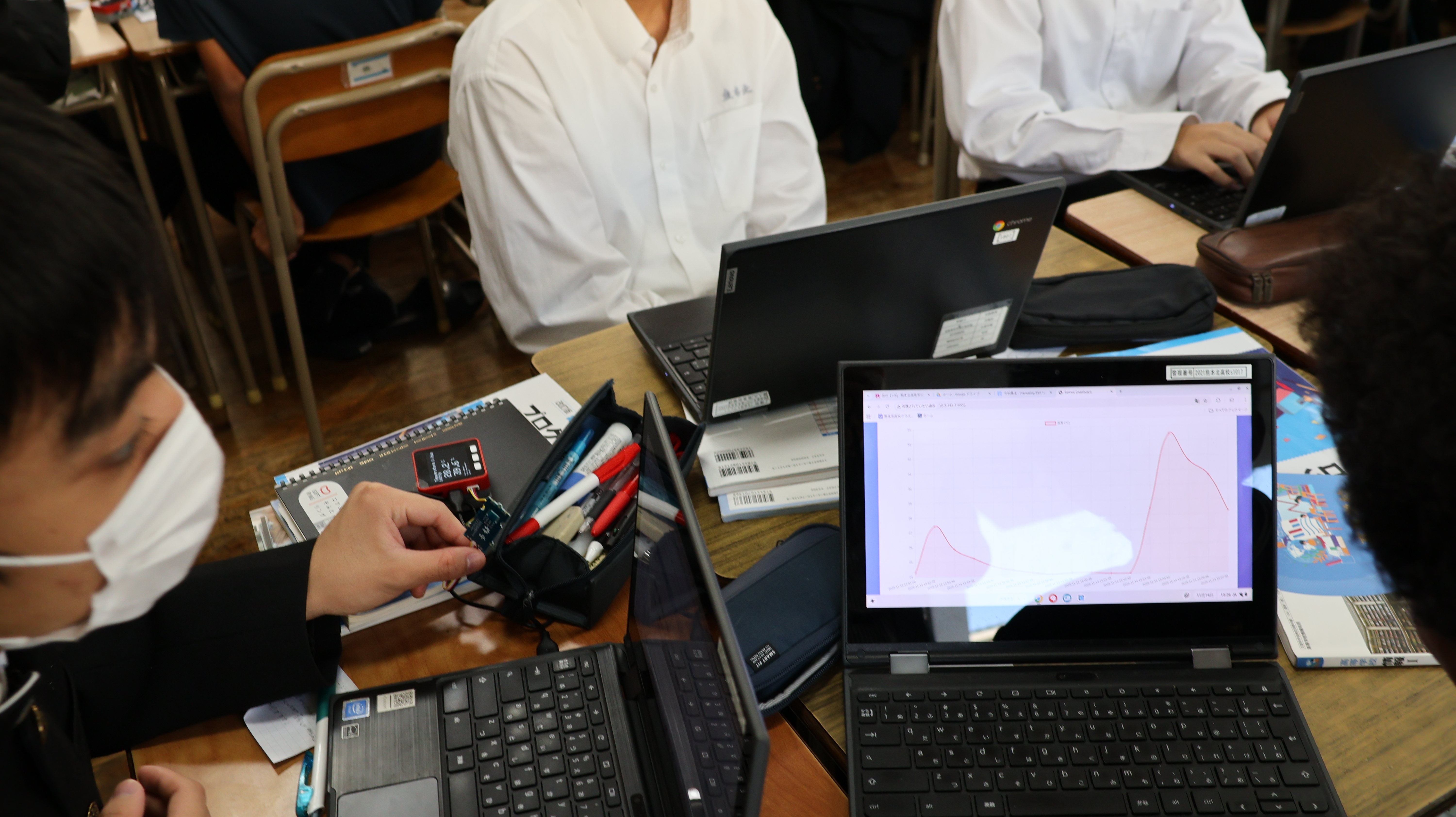 本講座は全3回を予定しており、初回となる今回、「データサイエンスとは」の話しから、普段の生活にはセンサーやデータがあふれていることについてお話しいただきました。データ収集だけでなく、データの可視化のデザインなど専門的なことを学ぶことができました。また、温度センサーをM5Stackで稼働させるためのプログラムをコーディングし、Raspberry Piをローカルのルーターとして無線接続させ、ローカル環境で動作する簡易的なデータロガーを作成することができました。センサーを緩め、データベース上のグラフの上昇を生徒自身で確認しており、データロガーの1歩を踏み出しいました。