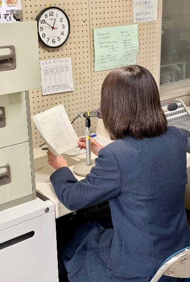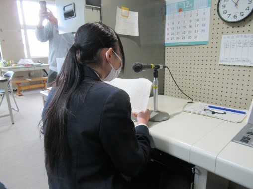12月7日(火)・8日(水)の昼休み、「冬の朗読会」が行われました。今回も、新型コロナウイルス感染症予防のため、「夏の朗読会」と同様に、全校生徒が教室で黙食をしている時間帯に15分間校内放送で実施しました。今回の放送部の朗読作品は、スーザン・バーレイ作「わすれられないおくりもの」(7日)、オー・ヘンリー作「賢者の贈り物」(8日)、吹奏楽部の演奏曲目は、サックス四重奏「ウィ・アー」(7日)、フルート三重奏「愛を感じて」(8日)でした。