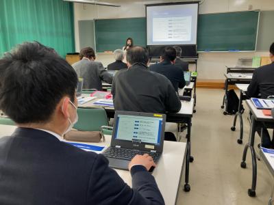 2つ目の研修では、リクルート社から講師を招き、本校で導入しているスタディサプリの活用について研修を行ないました。効果的な課題の配信と生徒の学習成果の分析の方法、ポートフォリオ機能の活用方法等について説明をいただきました。本校が県から指定を受けている1人1台端末先進実践校の取組として、説明資料を各自の端末に表示して研修を行ないました。スタディサプリの活用については、先生方からも多くの質問が寄せられ、新しい大学入試に向けてアイデアを膨らませることができました。この研修の様子は、県の教育政策課からも参観に来られました。