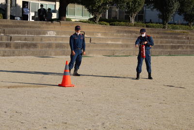消防署長から「おさない、かけない、しゃべらない、もどらない、ちかづかない(おかしもち)」を知った上で、防災意識を持って行動してほしいと講評を頂きました。また、消火器操作の説明では、「ピンを外し、ノズルを伸ばし、気合をいれて、押す(ピノキオ)」という言葉で、操作方法を分かりやすく教えて頂きました。