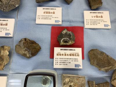 【過去の天草研修で北高生が掘り当てた琥珀の化石。御所浦初の発見だそうです。(写真中央の赤い敷物の上)】