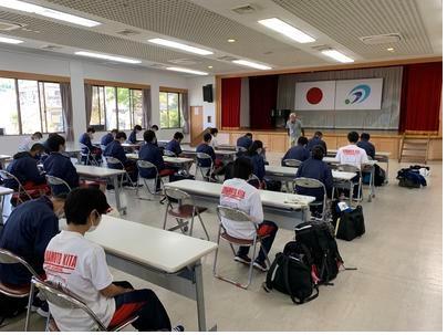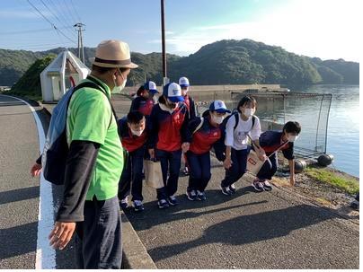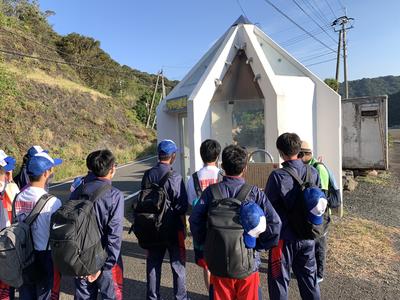健康観察を済ませ、午前8時に北高を出発しました。海上タクシーを利用して御所浦島へ渡り、検温と健康観察を行った後、入島式を行いました。