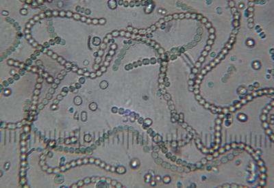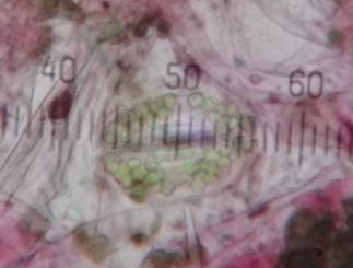 本校の光学顕微鏡で観察したイシクラゲ(石水母)と、接眼ミクロメーターです。