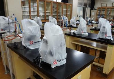 本校の光学顕微鏡は、1人1台あり、実習教師が実験前後に消毒をし、生徒に消毒用アルコールが準備されています。
