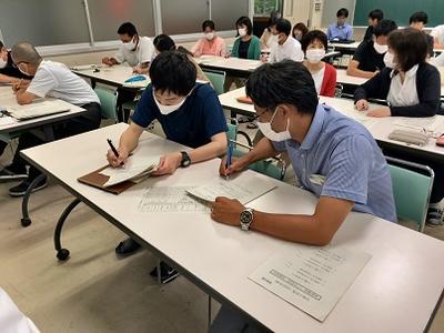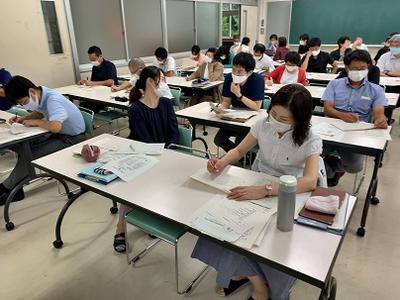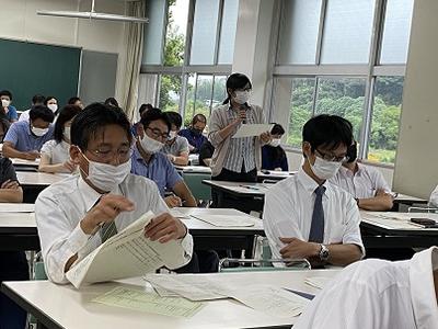 続いて人権教育の研修を行いました。今年6月に施行された熊本県部落差別解消推進条例について内容を確認した後、理科の橋口先生から実践発表を行っていただきました。さらに「第三次とりまとめ」についての内容を確認し、人権が尊重される授業づくりの視点について演習を行い、公民、理科、数学の先生に発表していただきました。