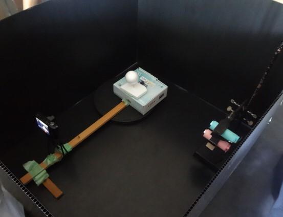 2年F組の地学班は、「光の反射」の実験をしています。周囲を黒いボードで囲み、月に見立てたボールに光を当てて、反射の様子を調べています。