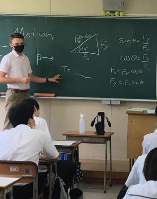 6月と7月の授業では、力学に関する学習を行いました。学習を進めていく上で重要となる用語を確認した後、英語による解説が行われ、その後、生徒たちは、グループで演習に取り組みました。
