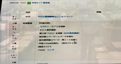5月7日から31日まで県立学校は休校が続いていますが、5月11日からの週からは、特別時間割を本校HPの特設サイトに提示し、生徒は各学年・クラスの時間割に応じて参考動画等を視聴して、確認テストを行うなどの家庭学習を進めていくことになります。