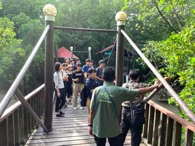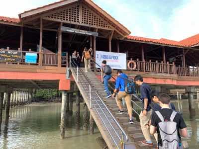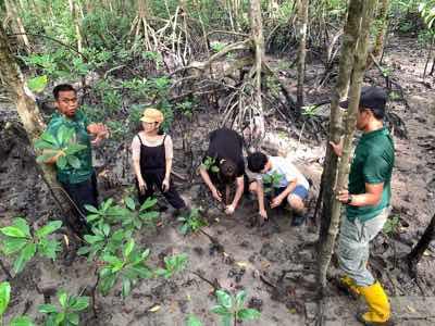研修3日目となる1月14日(火)は、午前中マレーシアのククップ国立公園でマングローブの植生について学習しました。細長い実を落とし、干潟に刺すことによって新芽を伸ばすことや、海水から取り込んだ塩分が蓄えられた葉を野生のサルが塩分補給に利用していることなど、理にかなった自然の仕組について様々な学習をすることができました。また、昨年の研修で植樹されたマングローブの成長を確認し、新たに3本のマングローブを植樹しました。
