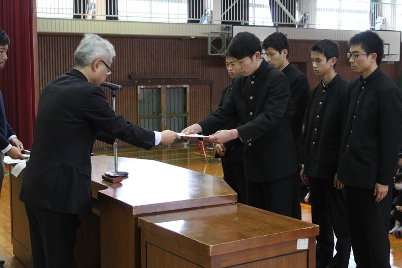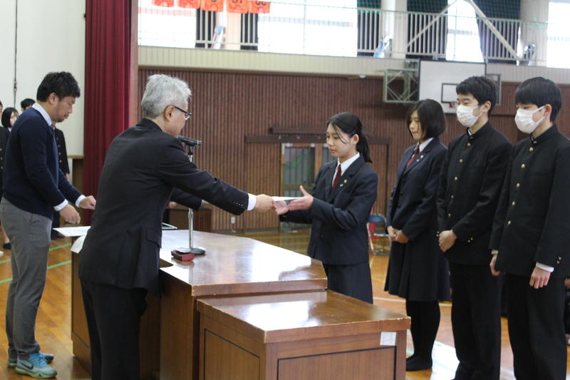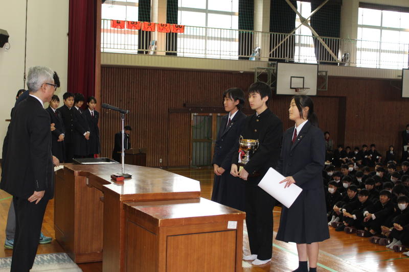 はじめに、2学期の表彰式を行われ、文化系・体育系問わず多くの部活動で表彰を受けました。表彰できなかった分については3学期に改めて実施します。生徒の皆さんの頑張りが結果として表れていて、嬉しく思います。