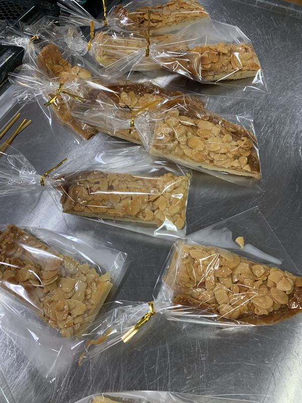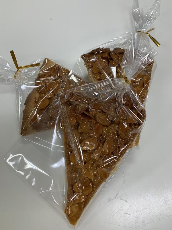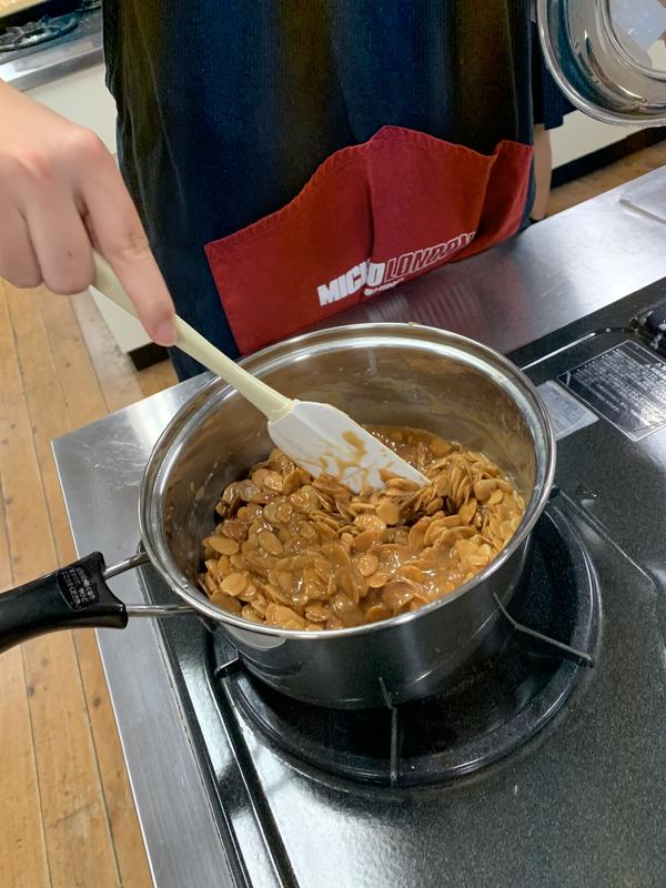 クッキー生地にキャラメルでコーティングしたナッツ(今回はアーモンドスライス)をのせて
