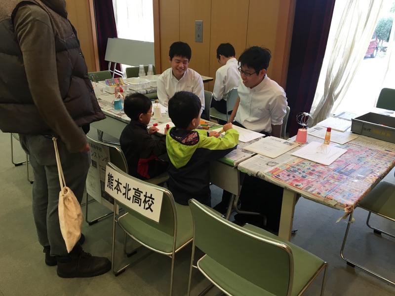 11月10日(日)に、科学展展示会場である熊本市環境総合センターで「理科おもしろ実験講座」が開催され、物理部員6名で「バランスとんぼ」と「くるくるシャボン玉」の工作を子どもたちと一緒に取り組みました。子どもたちはとても楽しそうでした。