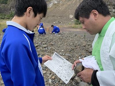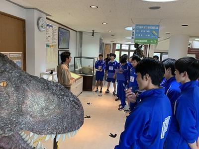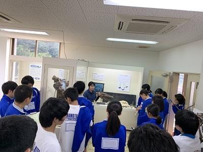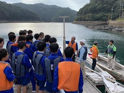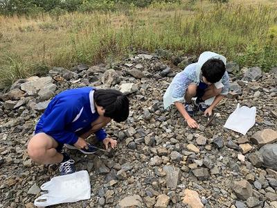 10月17日(金)から2日間、理数科1年生は天草市御所浦町へSSH天草研修に出かけました。御所浦は、日本ジオパークに指定されている地質学的にも重要な場所で、恐竜をはじめ様々な化石の発掘で有名です。入島式を終えた後、早速化石採集を行いました。トリゴニアという貝の化石やアンモナイトの化石を採集することができました。その後、白亜紀資料館で学芸員による解説を受けました。足跡の化石はその場所に生物が確実に生息していた証拠として重要なものになるなど、化石や地質学について興味深い話を伺うことができました。1日目の最後には伝馬船を漕ぐ体験をし、手漕ぎ船が進む原理を学習しました。