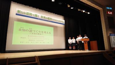 定員約200名の会場は満員。その中で、これまでに取り組んだ研究内容をもとに、堂々とした意見発表を行いました。発表では、熊本市の未来の姿をイメージしたイラストなどを提示し、参加者の方々から高い評価を受けることができました。また、シンポジウムへの参加準備を通して、熊本市の道路交通事情についても詳しく知ることができました。熊本市は、渋滞件数、市内中心部から空港までのアクセスといった多くの面で改善の余地があるそうです。シンポジウムでは、大西市長が「植木方面の方々が、益城町のグランメッセの催しに参加するために車を利用しようとしたとき、一体どれだけの時間がかかるのか」といった問いかけに、本校生をはじめ会場全体が郷土の現状を改めて認識する場面がありました。