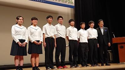 1枚目の写真は、本校生徒の発表のようす、2枚目の写真は、発表後、大西市長との記念撮影のようすです。