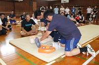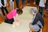 まず、熊本市消防局楠出張所から講師を招き、心肺蘇生法の研修を行いました。万が一の場合に備え、心肺蘇生法やAED、エピペンの使用法について、実技を交えて講習を受けました。