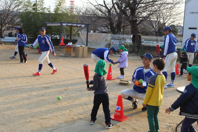 幼保連携型認定こども園西原の園児とおよそ1時間、ティーボールやストラックアウト、キャッチボールなどを通して、野球の面白さを伝えました。園児たちは元気いっぱいで、ティーボールやストラックアウトに何回もチャレンジしていました。園児の上達がとても早く、高校生も大変驚いていました。